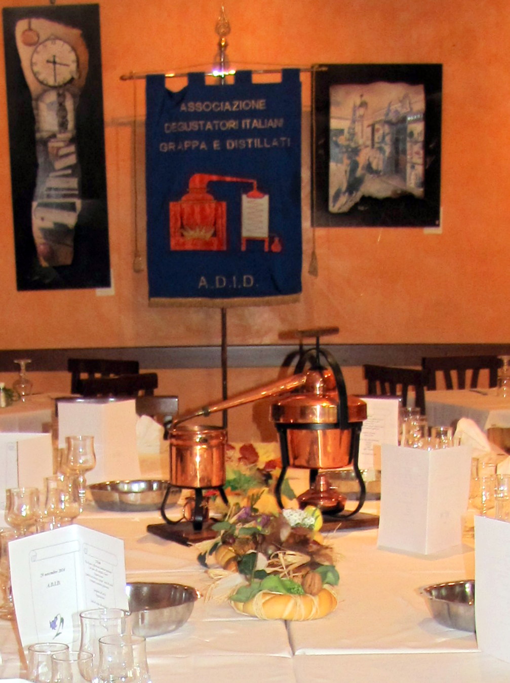 Il ristorante scelto quest’anno è stato il “Borgo Antico” di Bedizzole, con menù di pesce, proprio come per il Cenone di Natale. Dagli affumicati e marinati (e non solo!) all’astice, si è passati per Rum e Grappe invecchiati come apertura alla rana pescatrice, con una selezione di “fine cena” apprezzata intorno alla “torta ADID”. L’occasione degli Auguri è stata anche modo per annunciare l’imminente premiazione del concorso “Versi Distillati” giunto all’ottava edizione e che, proprio nella giornata che si apriva al termine della cena, stava arrivando a conclusione. Insomma, una serie di motivi, tra la rendicontazione delle attività dell’anno e chiacchiere diverse, per festeggiare in attesa dell’inizio del già annunciato nuovo corso per degustatori, previsto per il 26 gennaio 2015.