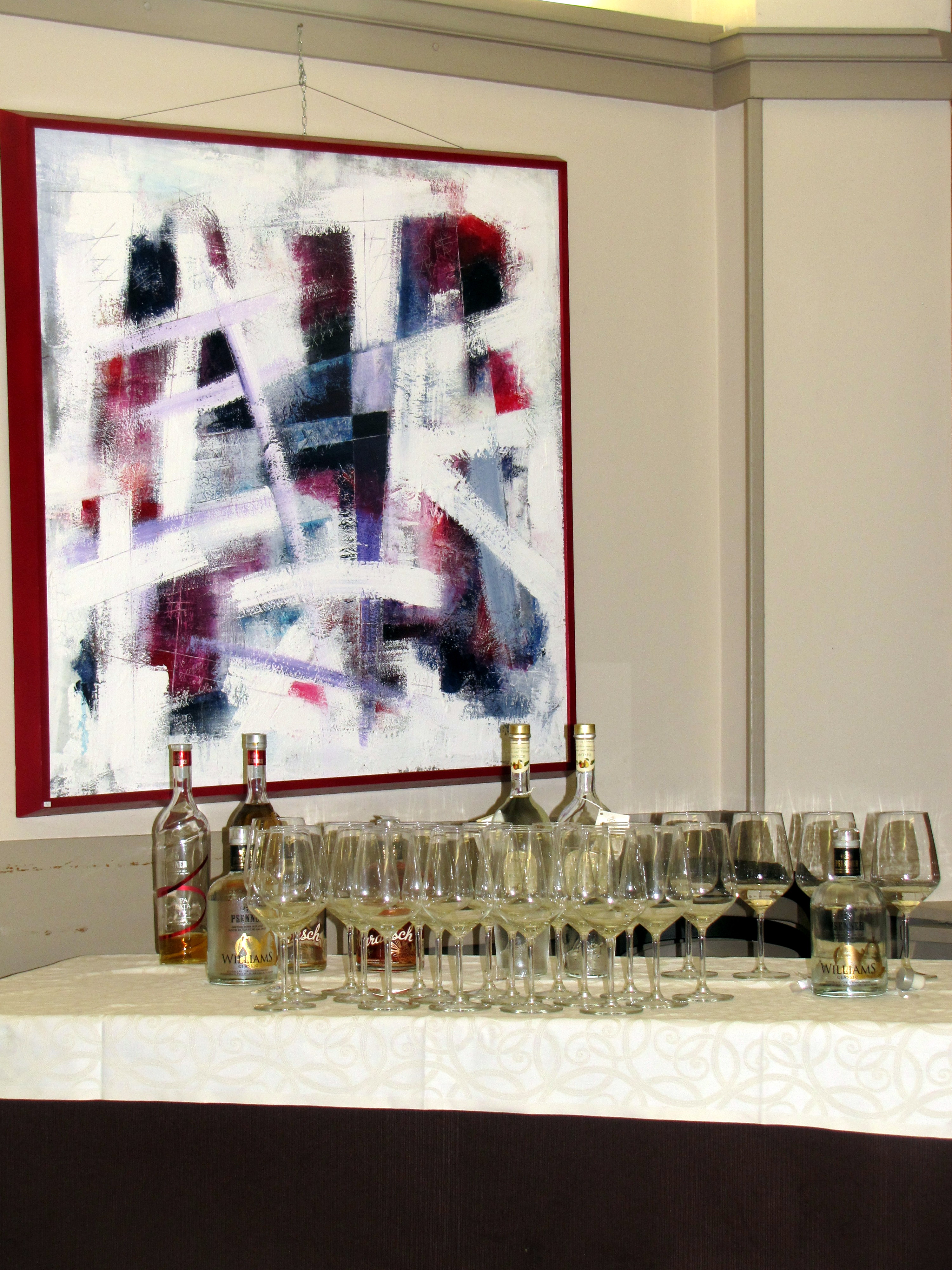 Dopo un eccezionale cocktail Hugo preparato personalmente dal Direttore commerciale Psenner, il menù ha portato al palato l’Almrausch con uno sformatino di melanzane e le zucchine ripiene (distillato A), seguito dalla Grappa Adorata (distillato B) con carne salada trentina e yoghurt greco con mele e noci; quindi il distillato di pere Williams (distillato C) con la pizza al formaggio stagionato della Valtrompia. Per concludere, l’Obstler di mele (distillato D) con pera su letto di crema pasticcera con ganasce al fondente e liquore al cioccolato e pere (distillato E).