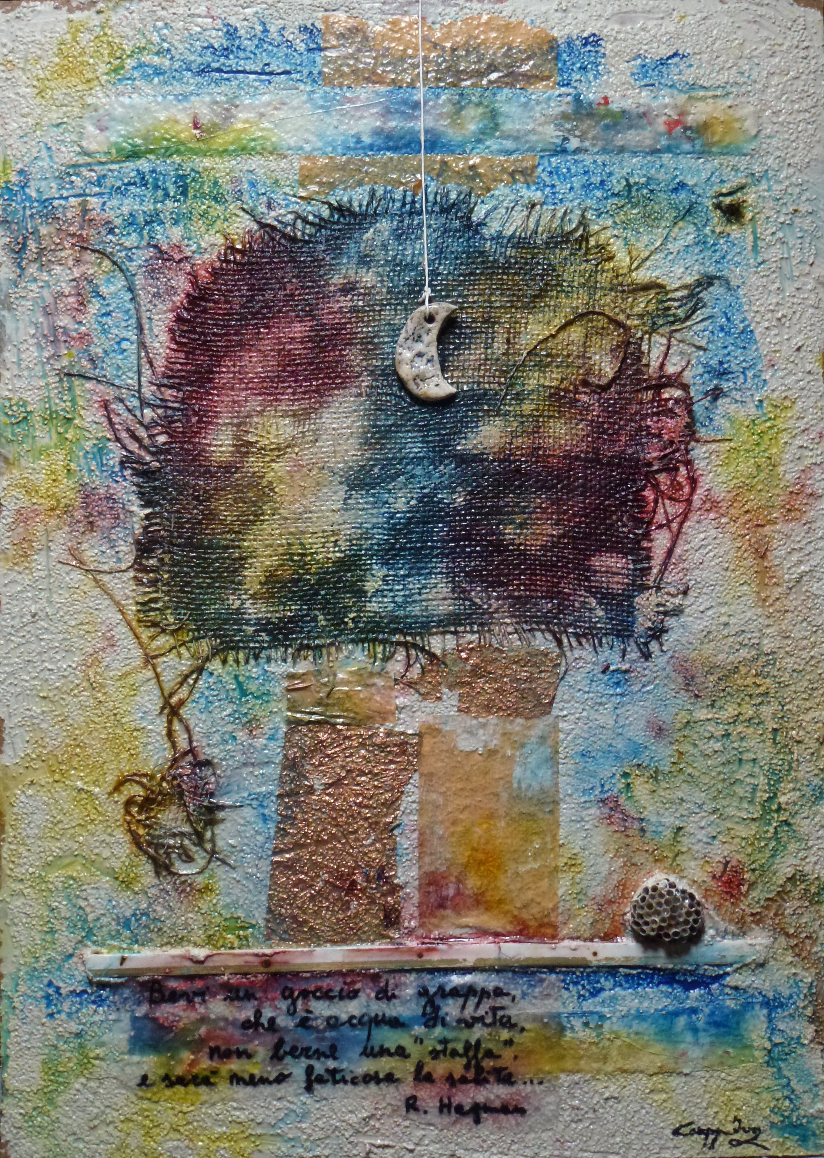 Giunta ad una tappa ancor più interessante, proprio la tecnica di Ivo Compagnoni attira l’attenzione per i molti materiali di riuso che campeggiano sulle sue tele, fatte di materia che rappresenta un umano di sempre maggiore spessore. In questo caso, il ciclo di quadri realizzati ha come argomento la Grappa, regina dei distillati Made in Italy. Non manca l’omaggio ad A.D.I.D. e al suo percorso di insegnamento e di degustazione, immortalato tra versi dedicati alla grappa e sniffer, con l’ambiente che non è mai secondario. Bedizzole, il campo, la trattoria storica, la natura che incontra l’uomo e si intreccia a lui in un connubio che diventa arte nel bicchiere o sulla tela. Una tela che ferma le emozioni della degustazione dei sensi, che sa essere traghettatrice di una tradizione antica e moderna di cui molto si è parlato nel convegno che ha fatto da cornice alla mostra di Compagnoni.