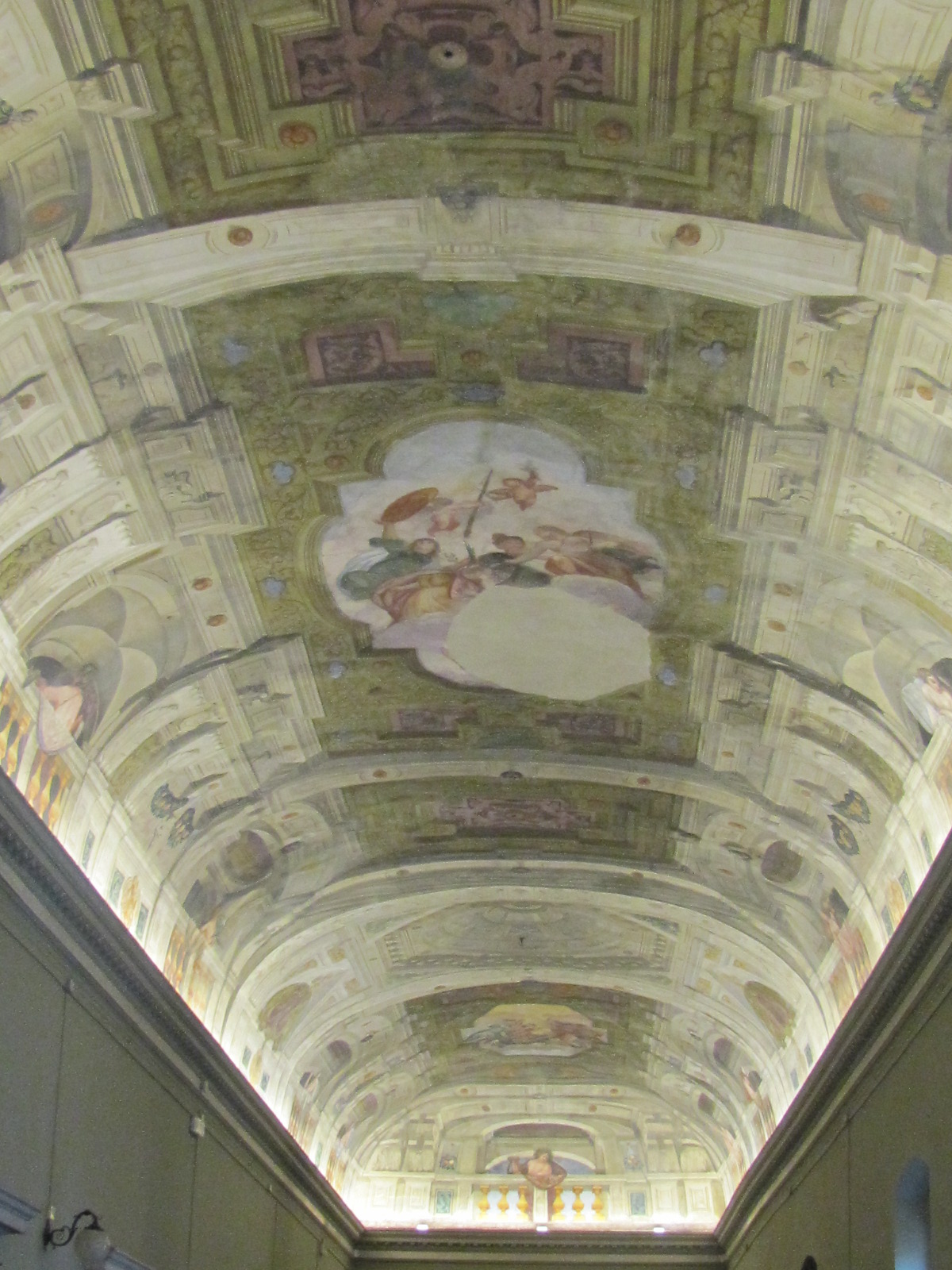 Lungo tutto il perimetro della linea d’imposta della volta a botte si apre un finto matroneo con balaustre dal quale di affacciano amorini e figure allegoriche di donne (la Fama, la Pace) e dei (Apollo, le muse). Sulla galleria affacciano nove sale, tutte decorate nella volta ad eccezione di tre, da Faustinelli e da Sorisene.