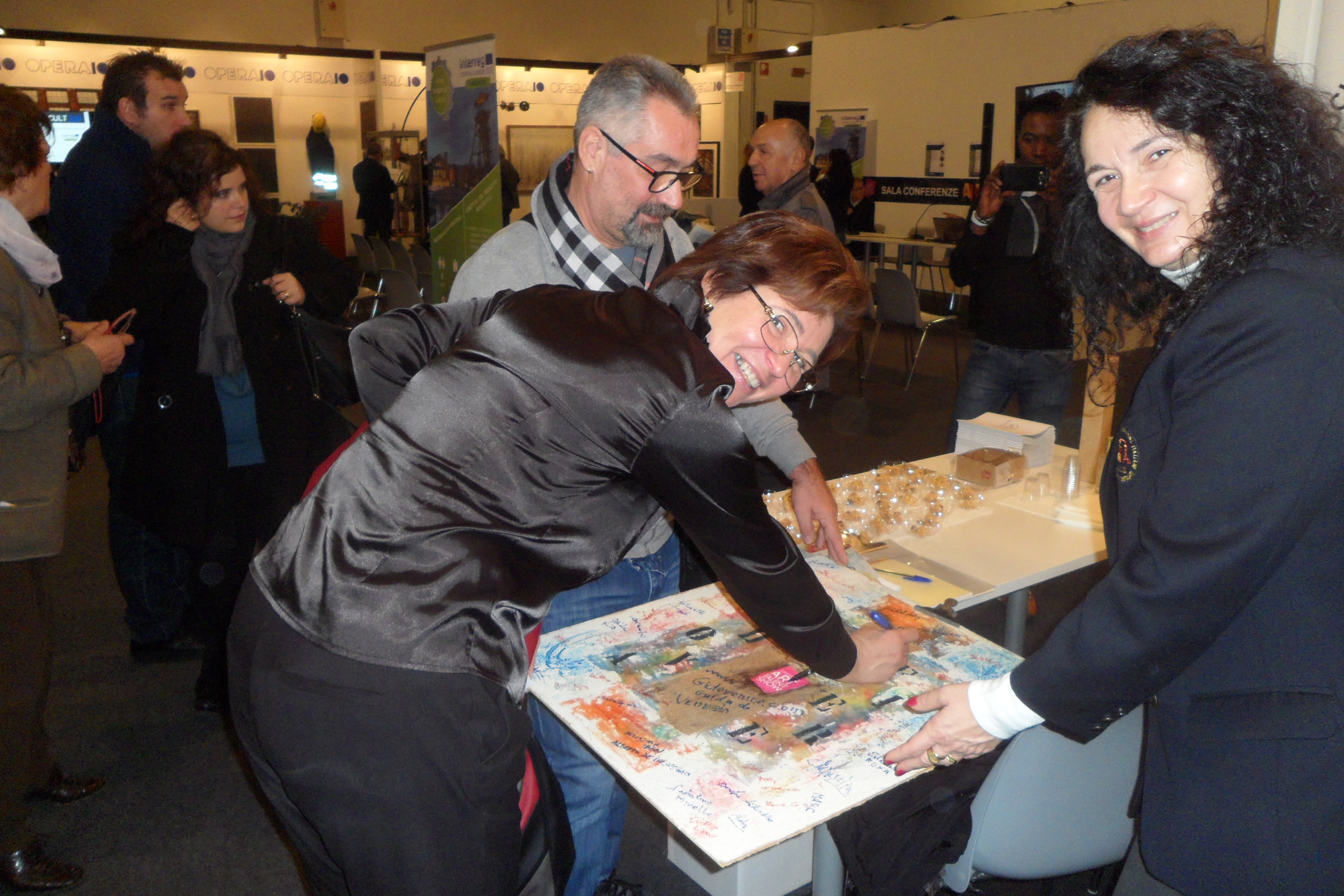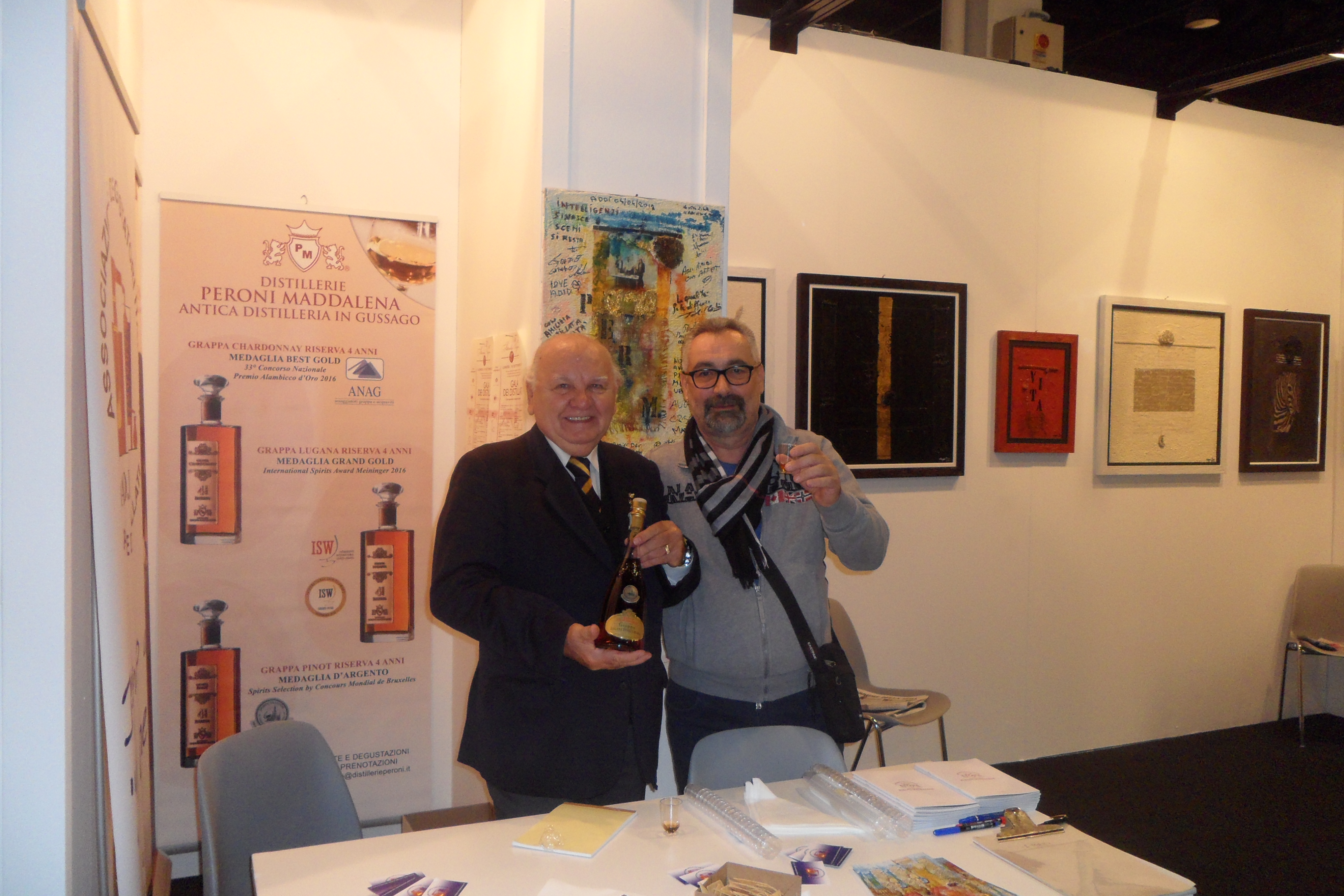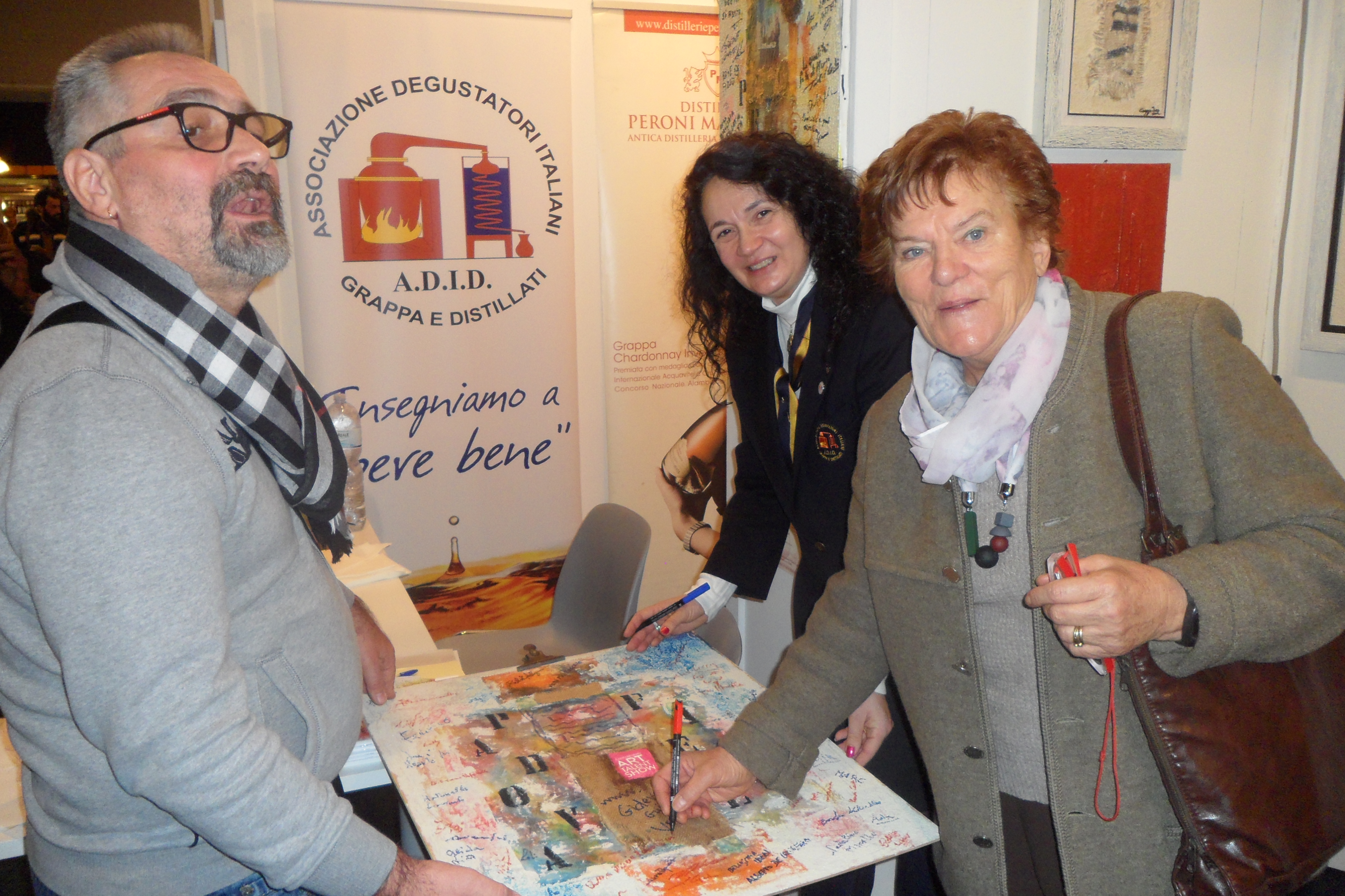 Molto apprezzati, ad esempio, i quadri con i tovaglioli di carta sotto l’immancabile nido di vespe e, talvolta, la luna. Casa, sogno, anche idillio, come nel degustare piccoli sorsi di capolavori di distillati, grappe invecchiate e barricate (di Lugana, di Pinot) premiate con la Silver Medal a Bruxelles. Accompagnate dalla sbrisolona artigianale che la Distilleria fa preparare a Mantova dalla ditta Bottoli oppure ai cracker Figulì, assolutamente apprezzati (grano italiano macinato a pietra e lievito madre, perfetti per l’abbinamento con i distillati perché non impattano il sapore al palato, anzi, lo accompagnano perfettamente). Moltissime le occasioni di incontro, proprio grazie ai distillati. Possibile spiegare l’attività di A.D.I.D. e la filosofia del “bere bene” che porta avanti; raccontare gli eventi e la grappa, a partire dal territorio fino alla bottiglia; sottolineare come l’arte del mastro distillatore può diventare quadro. Ecco allora che di nuovo si poteva firmare un quadro che Ivo finirà: su idea di Alessia, infatti, chi passava per lo stand e si fermava a chiacchierare un po’ poteva firmare, scrivere qualcosa su un quadro preparato dall’artista e che verrà finito a rassegna conclusa (domani alle ore 13).