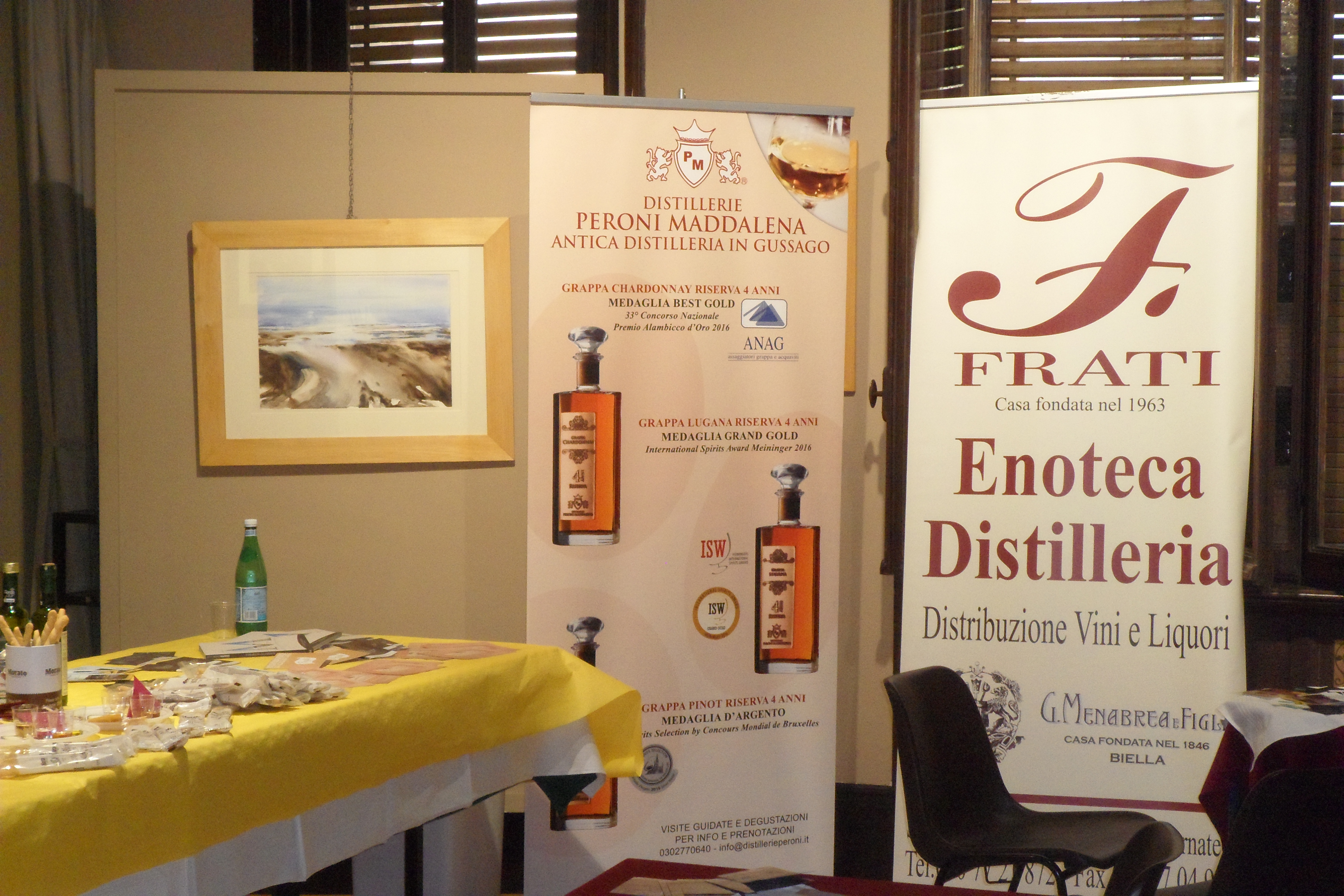 Grissani che, come dice il nome, sono grissini prodotti con standard di qualità altissimi, vero olio d’oliva e prodotti altamente selezionati, con produzione industriale che mantiene le caratteristiche di un impianto artigianale; in effetti molto apprezzati anch’essi dagli astanti, sia in pacchetto monoporzione che nei porta grissini contenenti i grissini dei pacchetti più grandi. Quindi, la Grappa di Lugana invecchiata delle Distillerie Peroni Maddalena di Gussago (Brescia), particolarmente adatta all’abbinamento per le sue note grezze che ricordano da vicino il vitigno, eppure rese armoniche e rotonde dalla distillazione e dal tipo di invecchiamento, come al solito nota distintiva della distilleria.