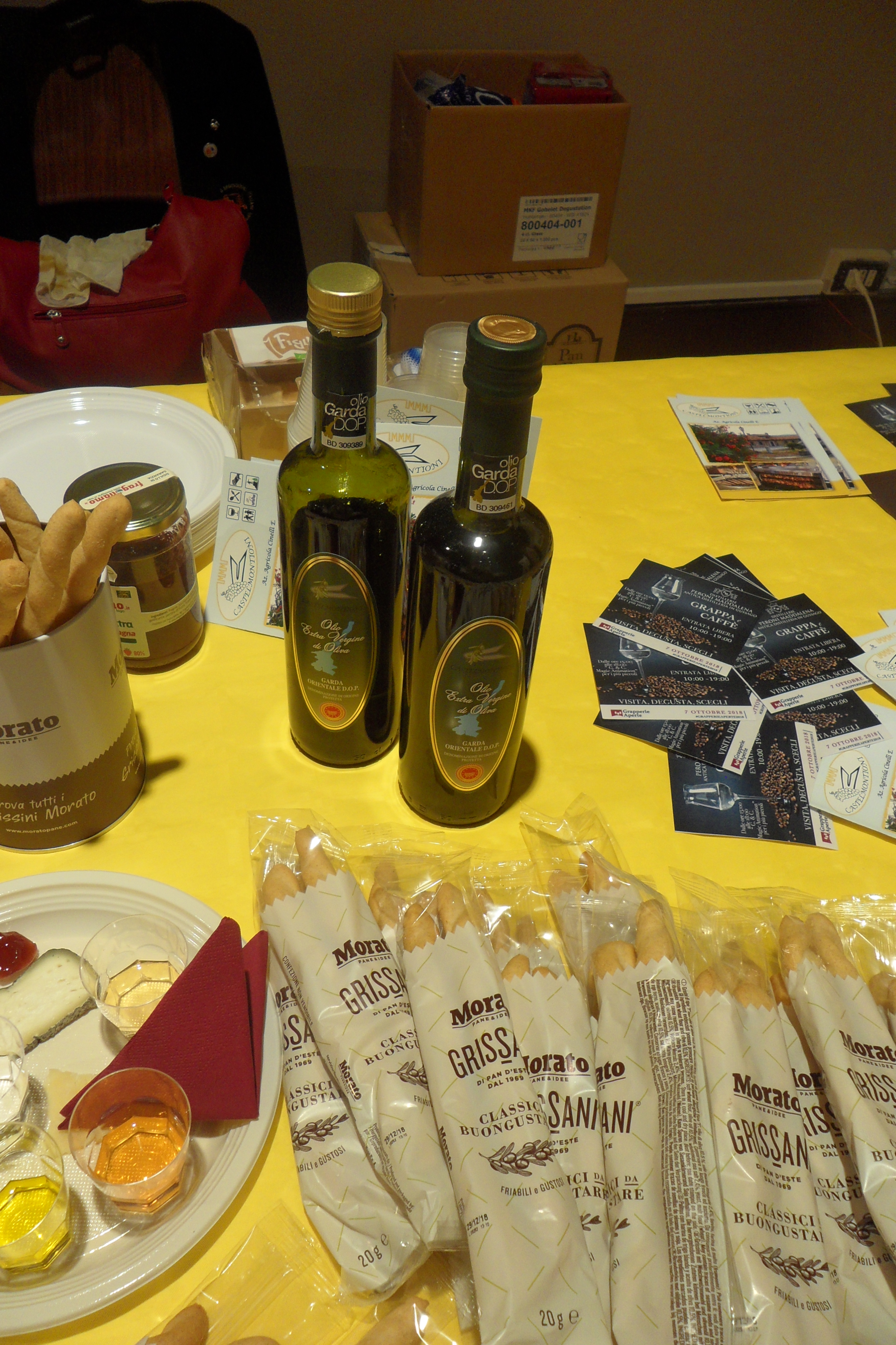 L’olio extravergine d’oliva DOP del Garda Orientale scelto, viene prodotto dall’Azienda Agricola Cinelli di Lazise (Verona) proposto al bicchierino a persone che, per la maggior parte, non conoscevano l’olio del Garda. L’olio in degustazione ha spiccate qualità benefiche per l’organismo umano, contribuendo ad abbassare naturalmente i livelli di colesterolemia e glicemia, nonché avendo un ottimo beneficio per la pelle, la circolazione e molto altro. Apprezzato al bicchierino, con i Figulì e anche con i Grissani Morato (Altavilla Vicentina) sia all’olio d’oliva che all’orzo, spesso intinti nell’olio, servito con molti rabbocchi.