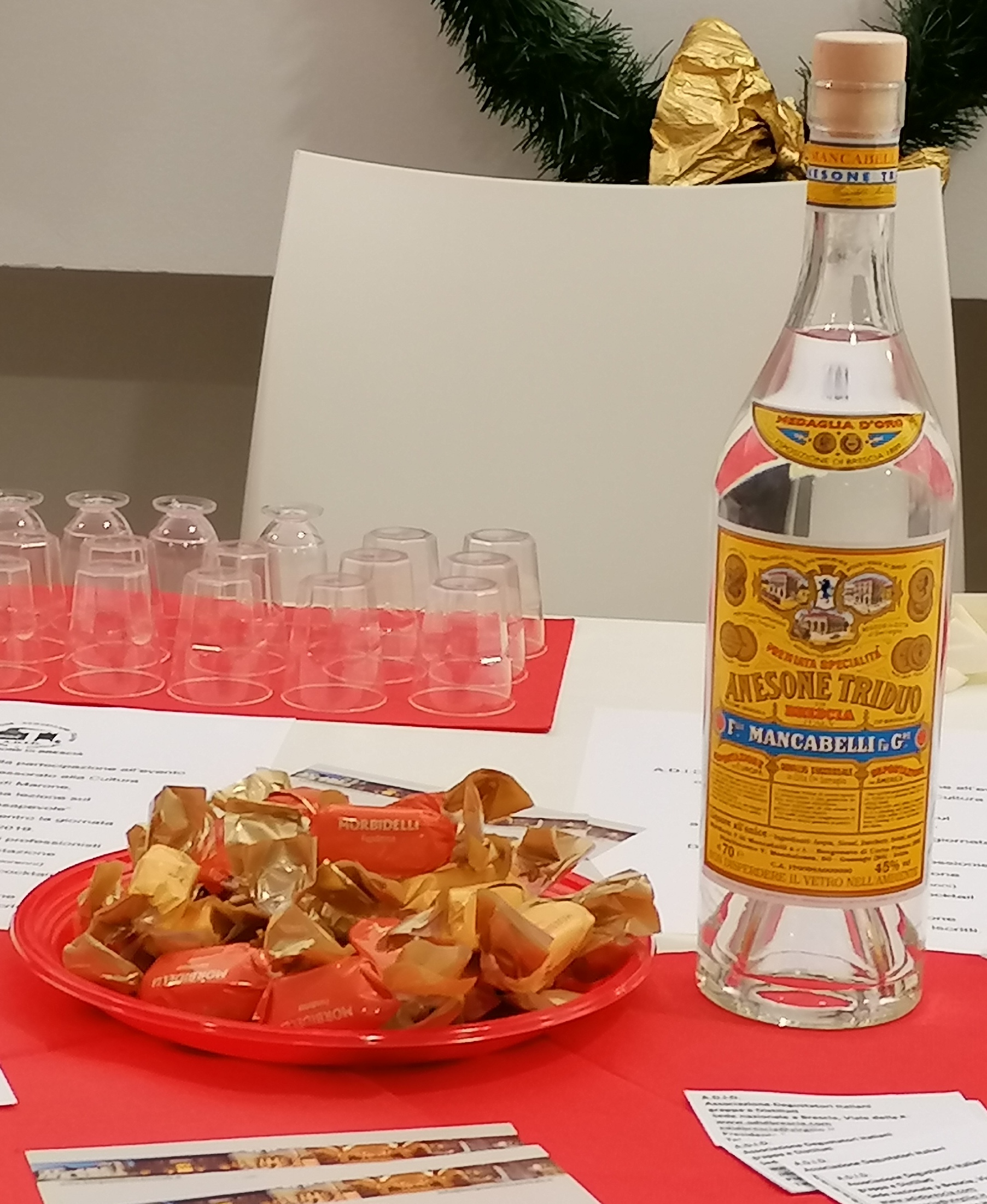 Con il buffet offerto dal Comune, A.D.I.D. ha portato in degustazione un prodotto bresciano dalla ricetta storica, l’Anesone Triduo (Distillerie Franciacorta) abbinato ai torroncini Morbidelli Sperlari ricoperti al cioccolato fondente e al cioccolato bianco.