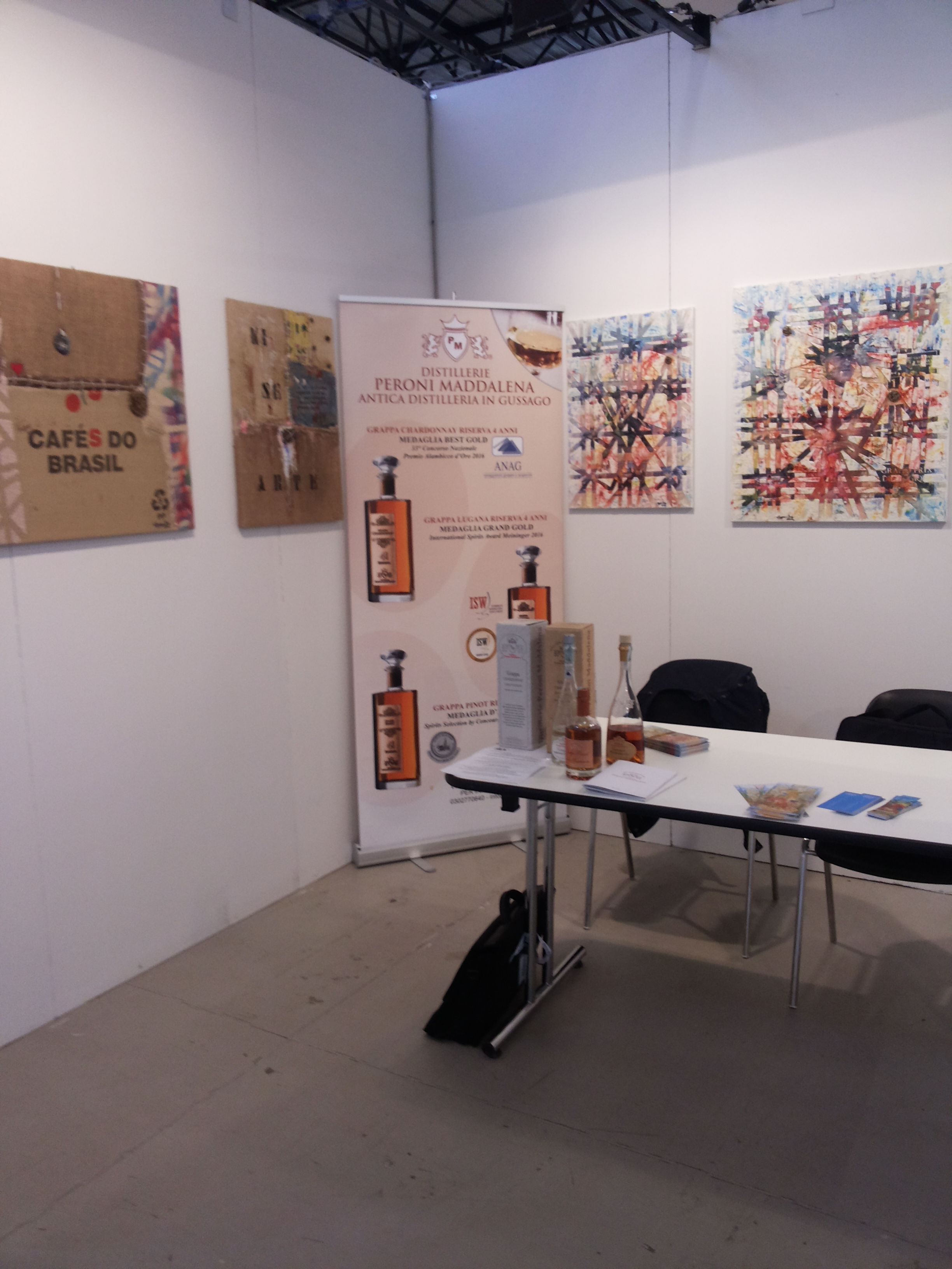 Giunta ad una tappa ancor più interessante, proprio la tecnica di Ivo Compagnoni attira l’attenzione per i molti materiali di riuso che campeggiano sulle sue tele, fatte di materia che rappresenta un umano di sempre maggiore spessore. In questo caso, il ciclo di quadri realizzati ha come argomento la Grappa, regina dei distillati Made in Italy. Non manca l’omaggio ad A.D.I.D. e al suo percorso di insegnamento e di degustazione, immortalato tra versi dedicati alla grappa e sniffer, con l’ambiente che non è mai secondario. Bedizzole, il campo, la trattoria storica, la natura che incontra l’uomo e si intreccia a lui in un connubio che diventa arte nel bicchiere o sulla tela. Una tela che ferma le emozioni della degustazione dei sensi, che sa essere traghettatrice di una tradizione antica e moderna di cui molto si è parlato nel convegno che ha fatto da cornice alla mostra di Compagnoni.